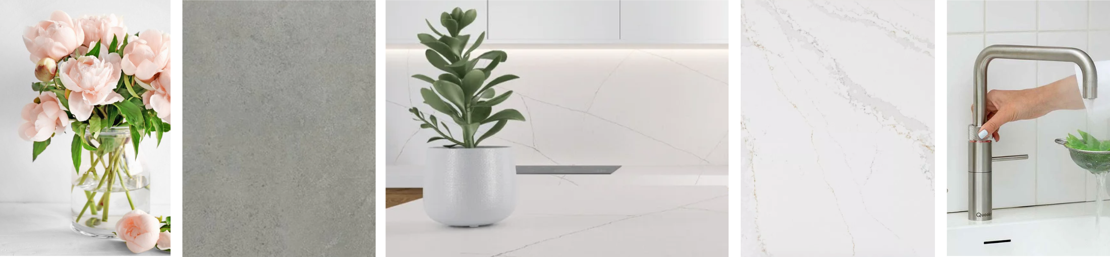 Matte, brushed metal fixtures, including a sleek Quooker tap